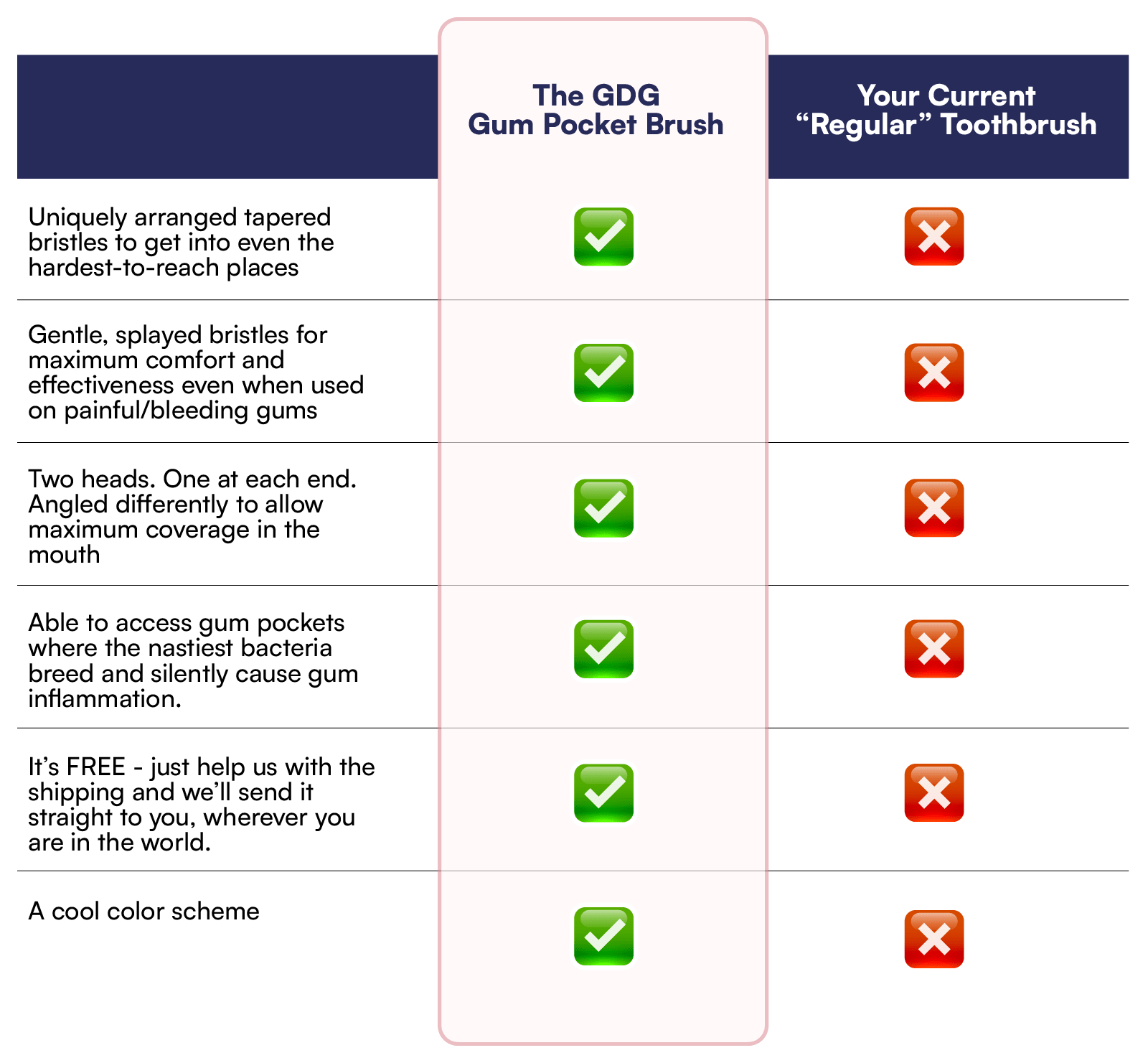 A brush designed by leading dentists, specifically to alleviate the SYMPTOMS and CAUSE of gum disease for FREE and the shipping costs less than you might spend in McDonalds.